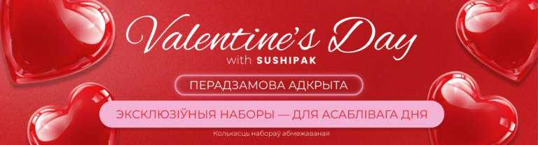 8x каліфорнія з крэветкай у тэмпуры, абгорнутая вугром і ласосем, масага, соўсам тэріякі i кунжутам, 8x каліфорнія з сырам філадэльфія і кампіёом, абгорнутая апаленым ласосем, соўсам тэріякі i кунжутам, 8x каліфорнія з сырам філадэльфія і авакада, абгорнутая ласосем, кунжутам, 6x футамакі з крэветкай у тэмпуры, агурком, салатам і вслегка острым маянэзам, 6x футамакі з ласосем, авакада, агурком, сырам філадэльфія і салатам, 6x футамакі з запечаным ласосем, сырам філадэльфія, авакада, агурком, кампіоі салатай, соўсам тэріякі i кунжутам