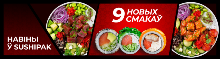 8x каліфорнія з ласосем, агурком, вслегка острым маянэзам, масагай, зялёнай цыбуляй, соўсам тэріякі і кунжутам, паніраваная ў хрумсткіх панка, 8x каліфорнія з вугром, крэветкай, імбірам, вслегка острым маянэзам, соўсам тэріякі і кунжутам, паніраваная ў хрумсткіх панка, 8x каліфорнія з вугром, агурком, сырам філадэльфія, соўсам тэріякі і кунжутам, паніраваная ў хрумсткіх панка, 8x каліфорнія з вэнджаным ласосем, агурком, авакада, зялёнай цыбуляй, соусам тэріякі і кунжутам, паніраваная ў хрумсткіх панка.