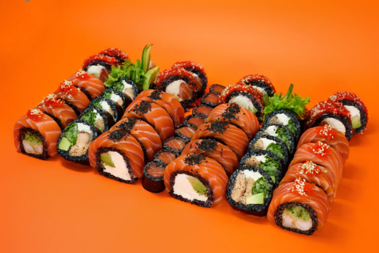 Black Rice! 8x california with philadelphia cheese and avocado, sesame seeds wrapped in salmon, 8x california with shrimp in tempura, cucumber and mildly spicy mayonnaise, masago, sesame seeds wrapped in salmon,12x Futomaki with baked salmon, philadelphia cheese, teriyaki sauce, sesame, avocado, cucumber and kanpyo, 8x california with salmon and avocado, cucmber, philadelphia cheese, masago, sesame seeds, 8x hosomaki with salmon