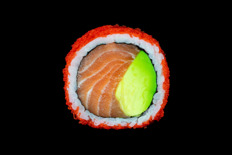 8x california z łososiem, awokado, majonezem lekko pikantnym i masago