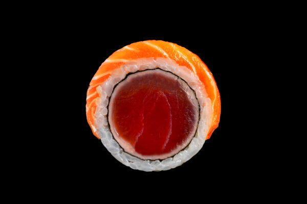 8x california z opalonym tuńczykiem, wasabi i olejem sezamowym, owinięta łososiem, posypana masago arare i szczypiorkiem