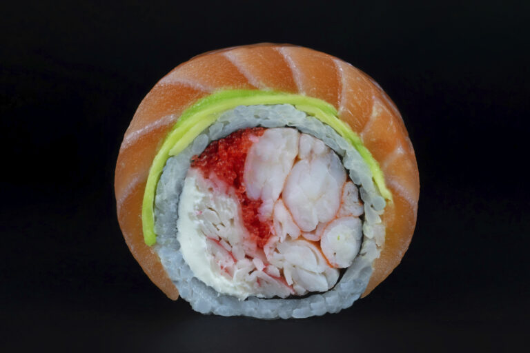 8x california z krewetką, sałatką z surimi, serkiem philadelphia, masago, sosem teriyaki i sezamem owinięta awokado i łososiem