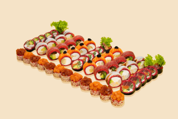 6x futomaki z serem philadelphia, krewetką w tempurze, łososiem, ogórkiem, awokado i sałatą;