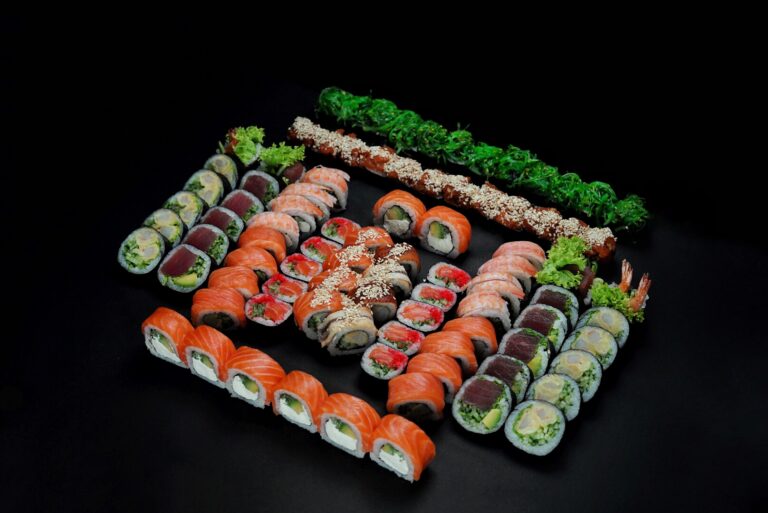 12x futomaki z łososiem, awokado, ogórkiem, serem philadelphia, 12x futomaki z tuńczykiem, majonezem na ostro, awokado, ogórkiem i sałatą, 12x futomaki z tatarem z łososia, ogórkiem, awokado, sałatem, masago, szczepiorek, sezam, 12x futomaki z krewetką w tempurze, ogórkiem, sałatą i majonezem na ostro, 12x futomaki z łososiem, serkiem philadelphia i wakame na górze, ogórkiem, kampio, sezamem, 8x california z krewetką w tempurze owinięta węgorzem i łososiem, sosem teryiaki, sezamem, masago, 8x california z serkiem philadelphia i awokado owinięta łososiem, masago, sosem teryiaki i sezamem, 8x california z krewetką w tempurze, ogórkiem i majonezem na ostro owinięta łososiem, 8x california z łososiem, serkiem philadelphia i ogórkiem, majonezem na ostro i sezamem owinięta krewetką