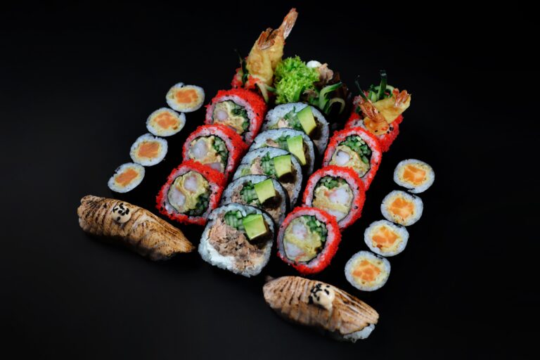 2x nigiri with torched salmon,mildly spicy mayonnaise and sesame seeds, 6x futomaki with backed salmon, philadelphia cheese, avocado, cucumber, kanpyo, lettuce, teriyaki sauce and sesame seeds, 8x california with shrimp in tempura, mildly spicy mayonnaise, cucumber, sesame and masago, 8x hosomaki with sweet patato in tempura