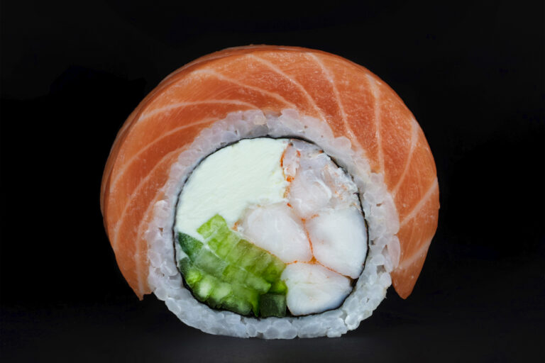 8x california z krewetką, serkiem philadelphia i ogórkiem owinięta łososiem