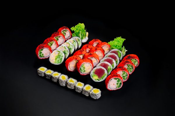 8x California rolls with tempura shrimp, mildly spicy mayonnaise, cucumber, sesame seeds, and masago, 8x california with shrimp, mildly spicy mayonnaise, cucumber, masago and sesame, 6x futomaki with tempura shrimp, cucumber, lettuce, and mildly spicy mayonnaise, 6x futomaki with tuna, mildly spicy mayonnaise, avocado, cucumber and lettuce, 8x oshinko maki in tempura
