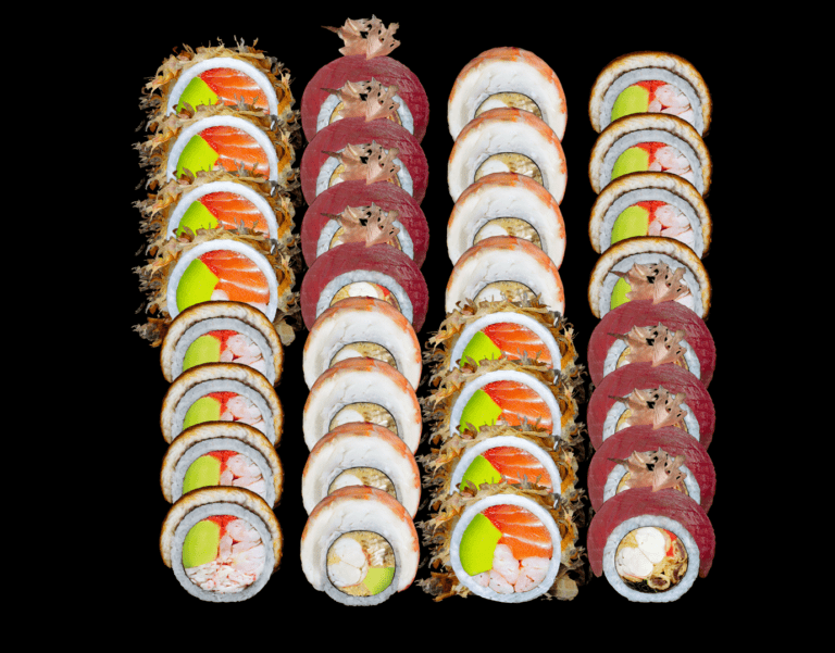 8x california z krewetką w tempurze, kanpyo w tempurze, szczypiorkiem, masago, majonezem lekko pikantnym, wiórkami z tuńczyka, owinięta tuńczykiem, 8x california z łososiem, krewetką, awokado, masago, majonezem lekko pikantnym i wiórkami z tuńczyka, 8x california z krewetką w tempurze, węgorzem w tempurze, awokado, majonezem lekko pikantnym, sosem teriyaki i masagą owinięta krewetką, 8x california z krewetką, sałatką z surimi, awokado, masago, sosem teriyaki i sezamem owinięta węgorzem
